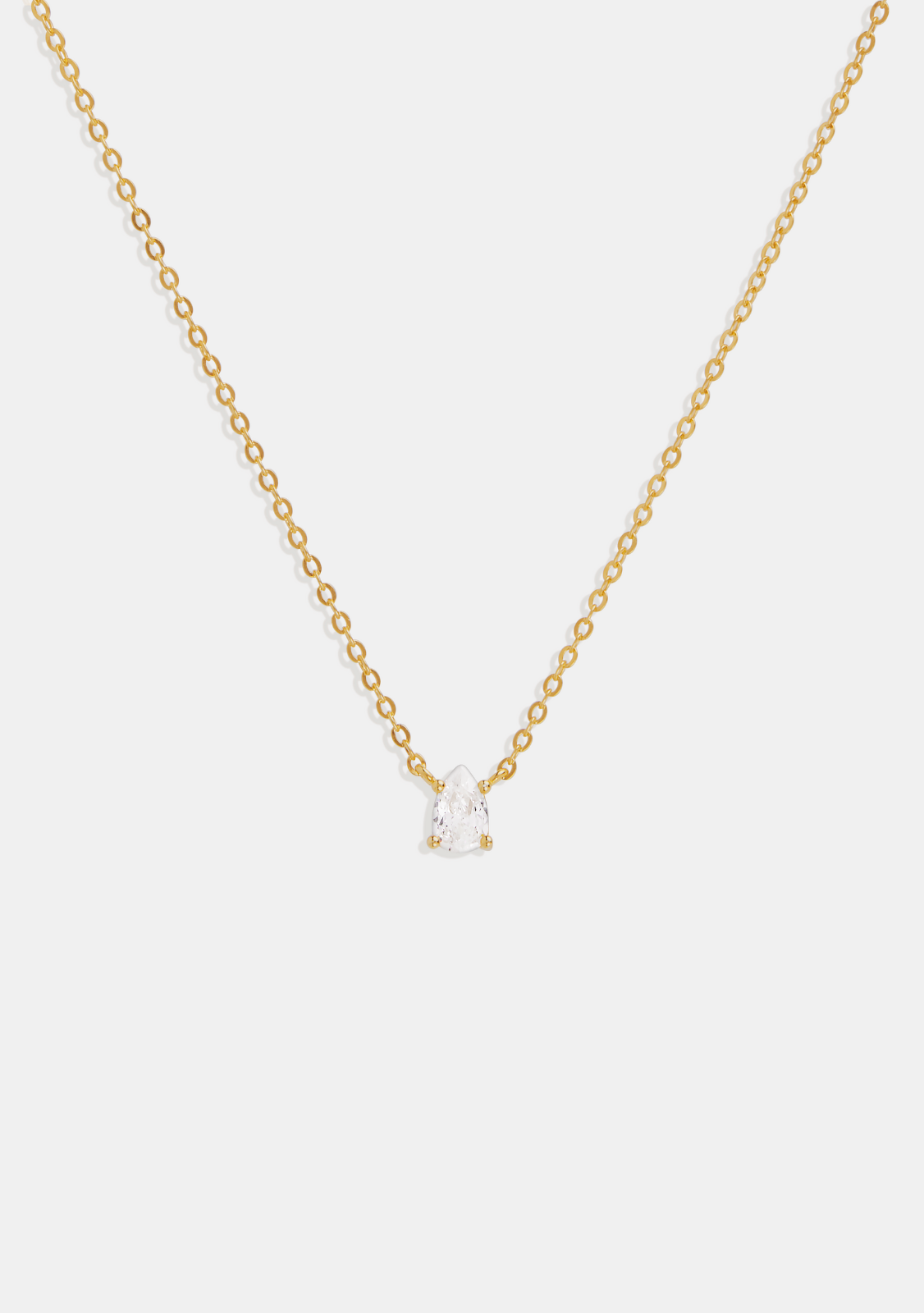 The Valentine Necklace features a striking pear shaped cubic zirconia pendant on a delicate gold chain - let your décolletage twinkle with this timeless design.